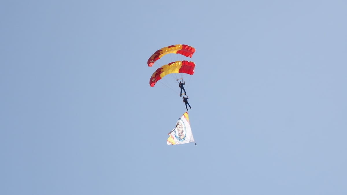 La clausura del evento estuvo marcada por las maniobras de las unidades de élite del Ejército del Aire y del Espacio. En primer lugar, la Patrulla Acrobática de Paracaidismo (PAPEA) ejecutó una serie de saltos de precisión, en los que los paracaidistas descendieron portando banderas institucionales y conmemorativas ante el público congregado.