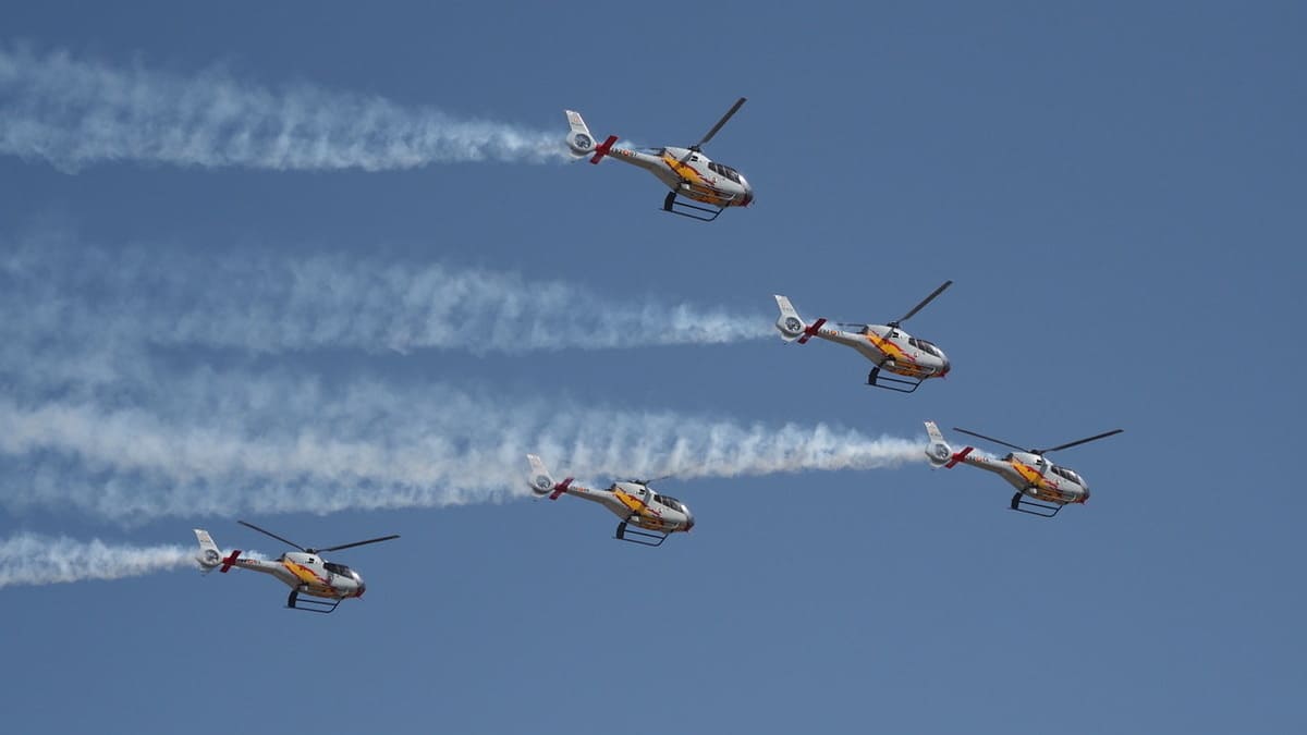 Seguidamente, los helicópteros de la Patrulla ASPA cerraron la jornada con una exhibición de vuelo coordinado. Esta unidad realizó diversos ejercicios de maniobrabilidad y formaciones en abanico, empleando sistemas de humo para marcar las trayectorias en el espacio aéreo de Palos de la Frontera, poniendo fin a los actos conmemorativos del centenario.